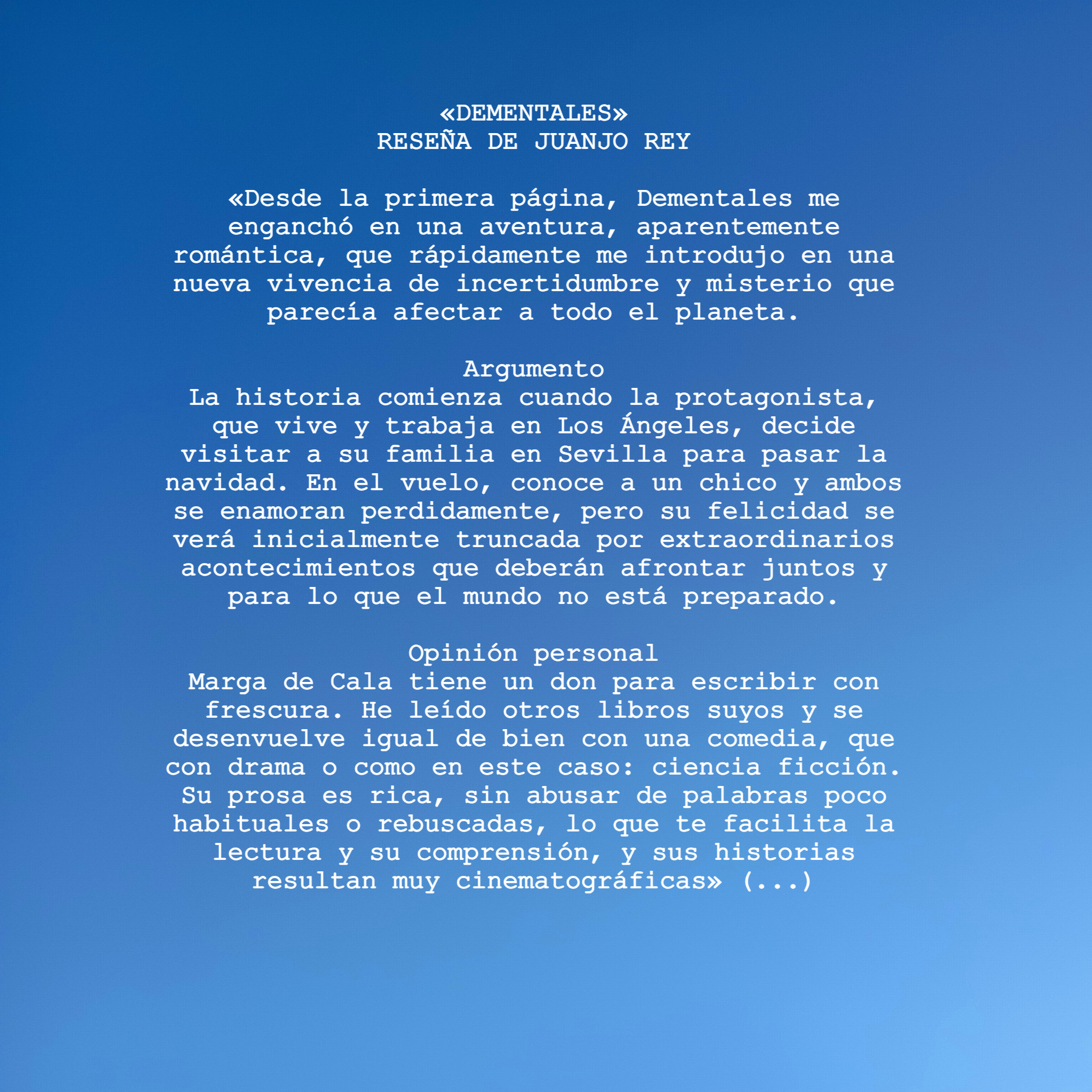 «Desde la primera página, Dementales me enganchó en una aventura, aparentemente romántica, que rápidamente me introdujo en una nueva vivencia de incertidumbre y misterio que parecía afectar a todo el planeta.