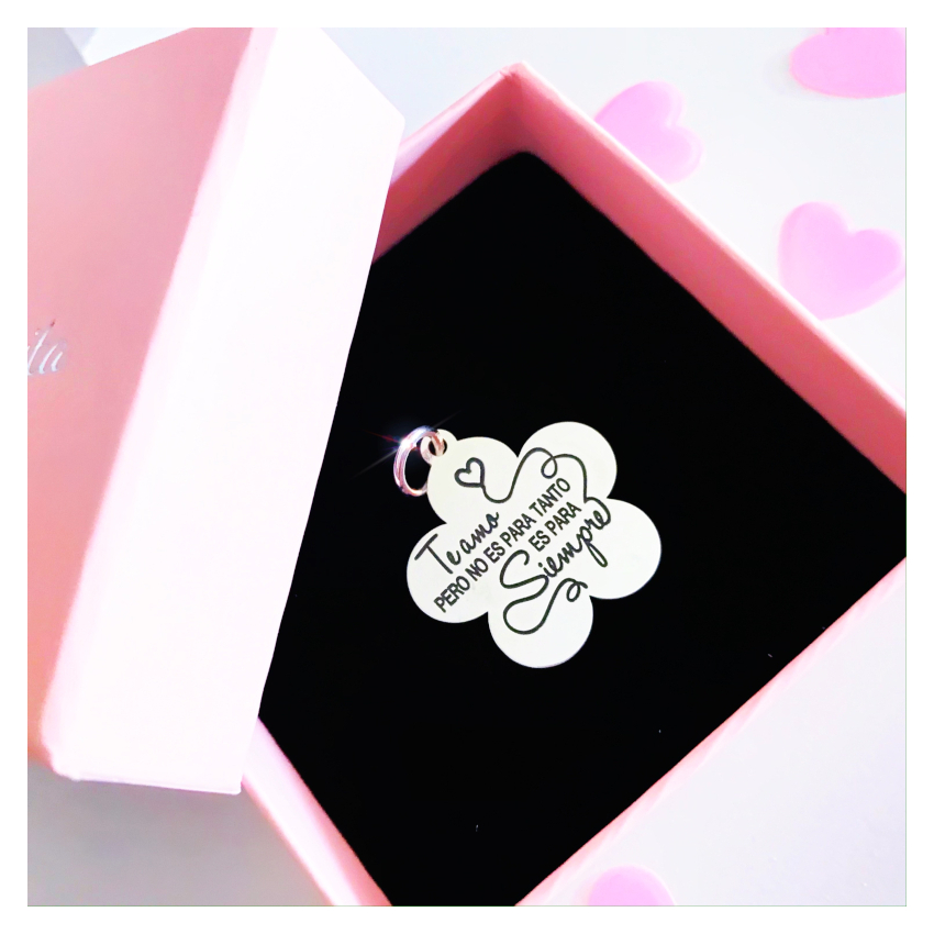 Colgante plata de ley 925 forma de flor de 2.3 cm. x 2.3 cm.. Colgante liso con mensaje «Te amo pero no es para tanto, es para siempre». Fabricación láser.